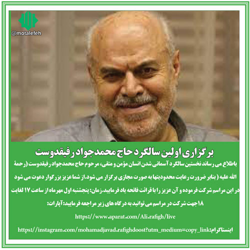 باطلاع می رساند نخستین سالگرد آسمانی شدن انسان مؤمن و متقی، مرحوم حاج محمدجواد رفیقدوست (رحمه الله علیه ) بنابر ضرورت رعایت محدودیتها به صورت مجازی برگزار می شود.